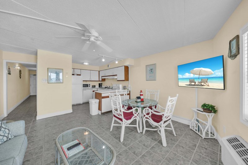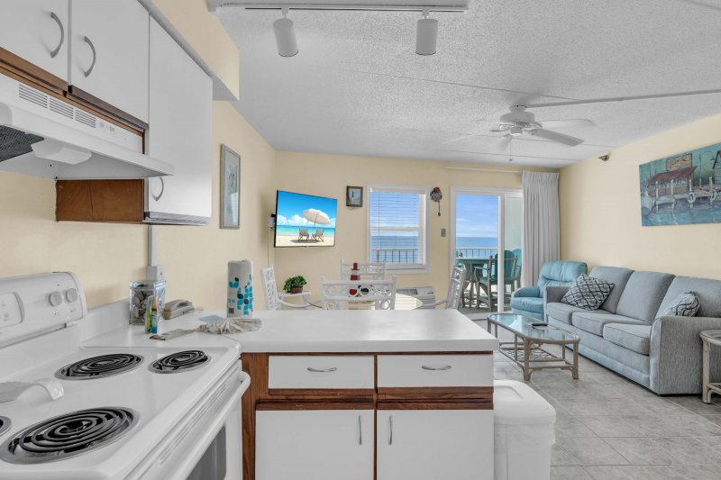 The coastal-inspired decor creates a light and airy feel, with soft tones and plenty of natural light. The living room features a plush sofa sleeper, a cozy recliner, and a large flat-screen TV, perfect for unwinding after a day in the sun. Step onto the private Gulf-front balcony and take in the stunning shoreline views—whether you're enjoying your morning coffee or winding down with a sunset.