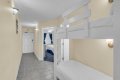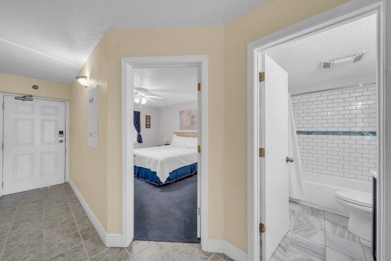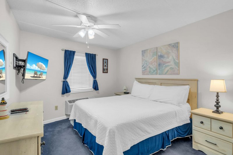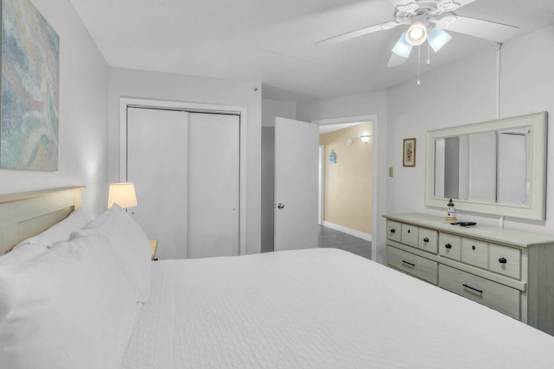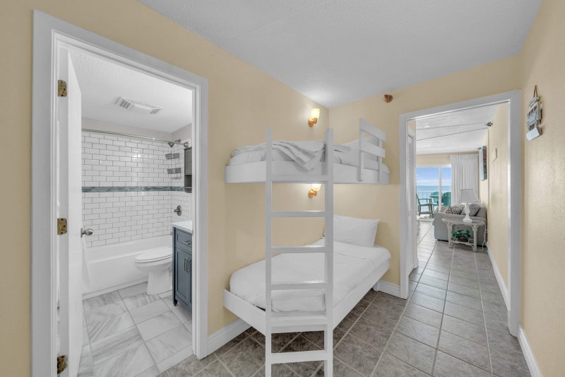 The spacious master bedroom features a king-size bed, a flat-screen TV, and plenty of storage for a comfortable stay. The hallway bunk nook is a great spot for kids or extra guests, ensuring everyone has a cozy place to rest.